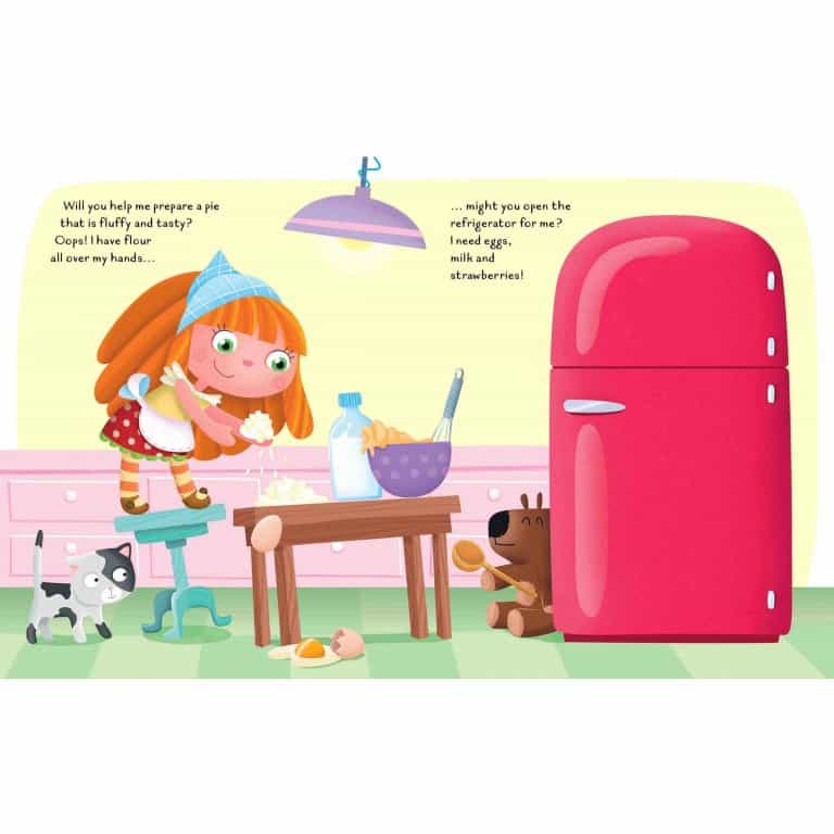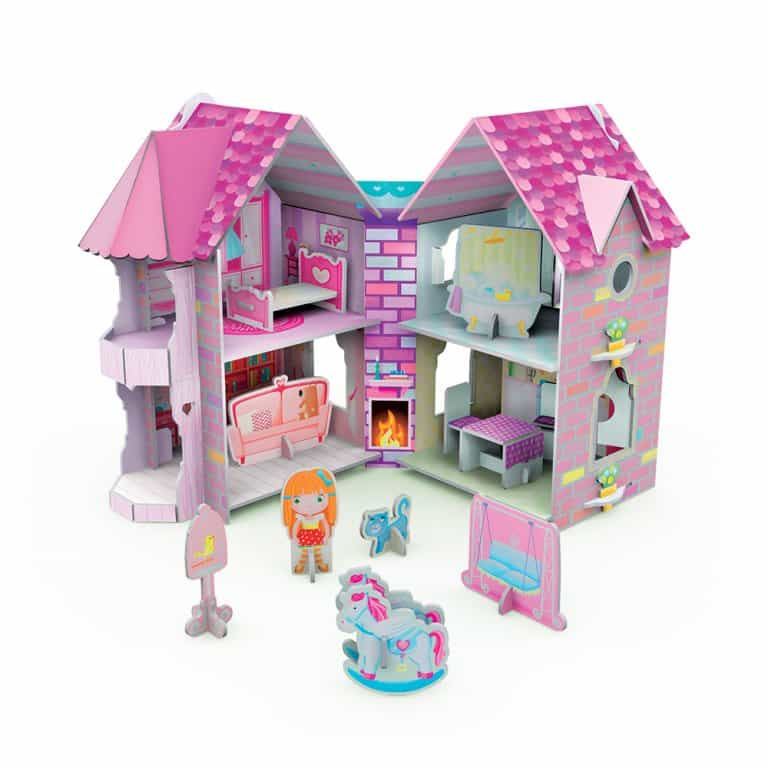 A friendly doll lives in her own pink and white dollhouse. She likes to relax in the living room, read a book in the bedroom, bake cookies in the kitchen and get cleaned up in the bathroom! Put together this charming dollhouse and peek through the windows, then open it wide and get a good look at all the rooms. Arrange the furniture any way you like!